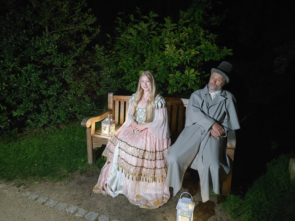 Prawdziwy tajemniczy ogród, oświetlany dyskretnie przez oprowadzającą p. Kingę Dyjetę-Nowak, w towarzystwie Katarzyny Broniewskiej, która dzieliła się swoją bogatą wiedzą dotyczącą drzew i krzewów. W obchodach po dawnych włościach nie mogło zabraknąć Tytusa Działyńskiego (Włodzimierz Rocławski) I Białej Damy (Maria Lewek), zbudowanych taką profesjonalną opieką nad ich ogrodem. Ogrodem, którego też strzeże niezmiennie duch lasu (Monika Śliwińska) wraz ze skrzatami (młodzi Śliwińscy), rusałkami (Zosia Jarczyńska i wnuki Janiny Różak), urzędującymi w pełnej tajemniczości cisowej alei. I stamtąd dalej rozrabiać… Bo najlepiej łączyć naukę z zabawą.